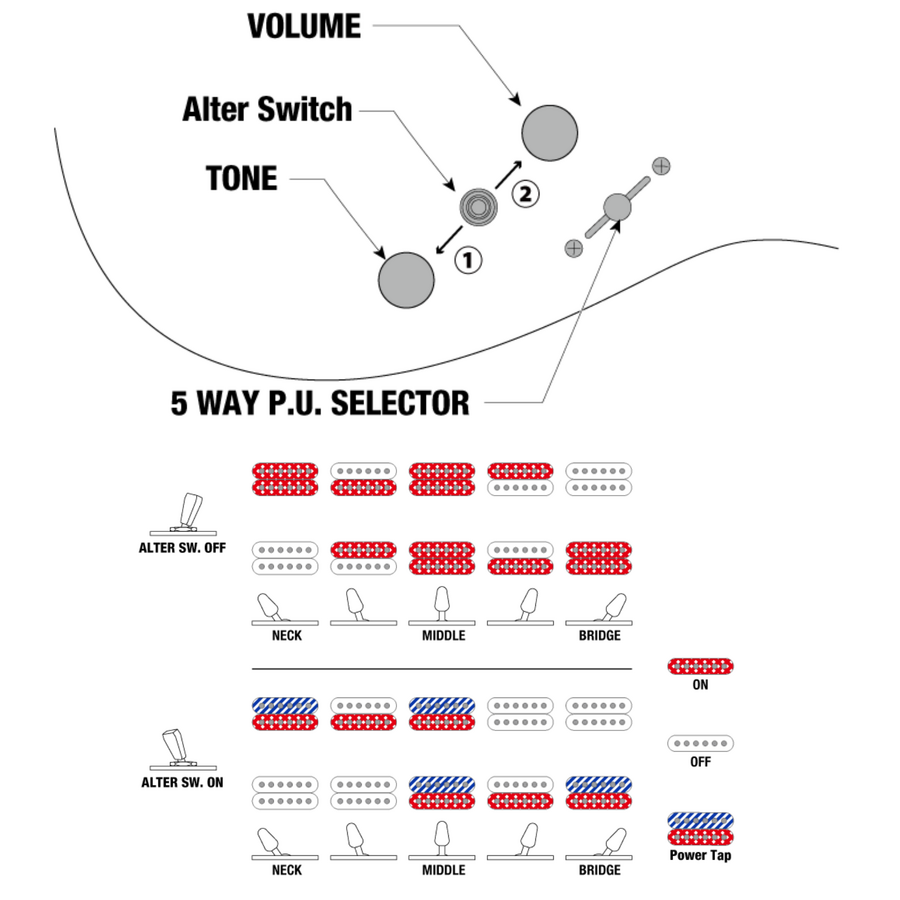 dyna-MIX10 switching system with Alter Switch The dyna-MIX 10 offers ten sound variations and can easily switch from humbucker and single coil modes with the mini switch. The power Tap mode provides a realistic single coil sound despite its two humbucker pickup layout.