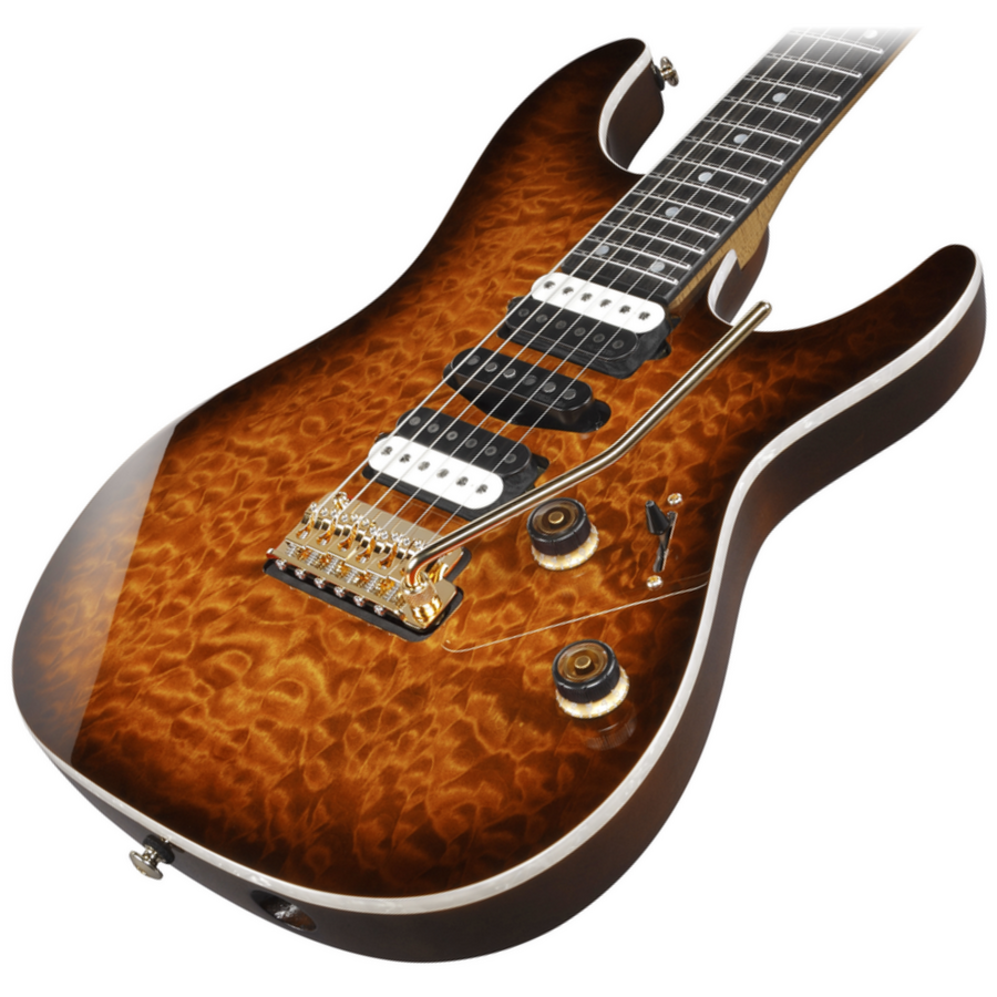 Quilted Maple top / American Basswood body The Quilted Maple top sonically enriches the response for picking and the American Basswood body delivers a natural and flat tone.