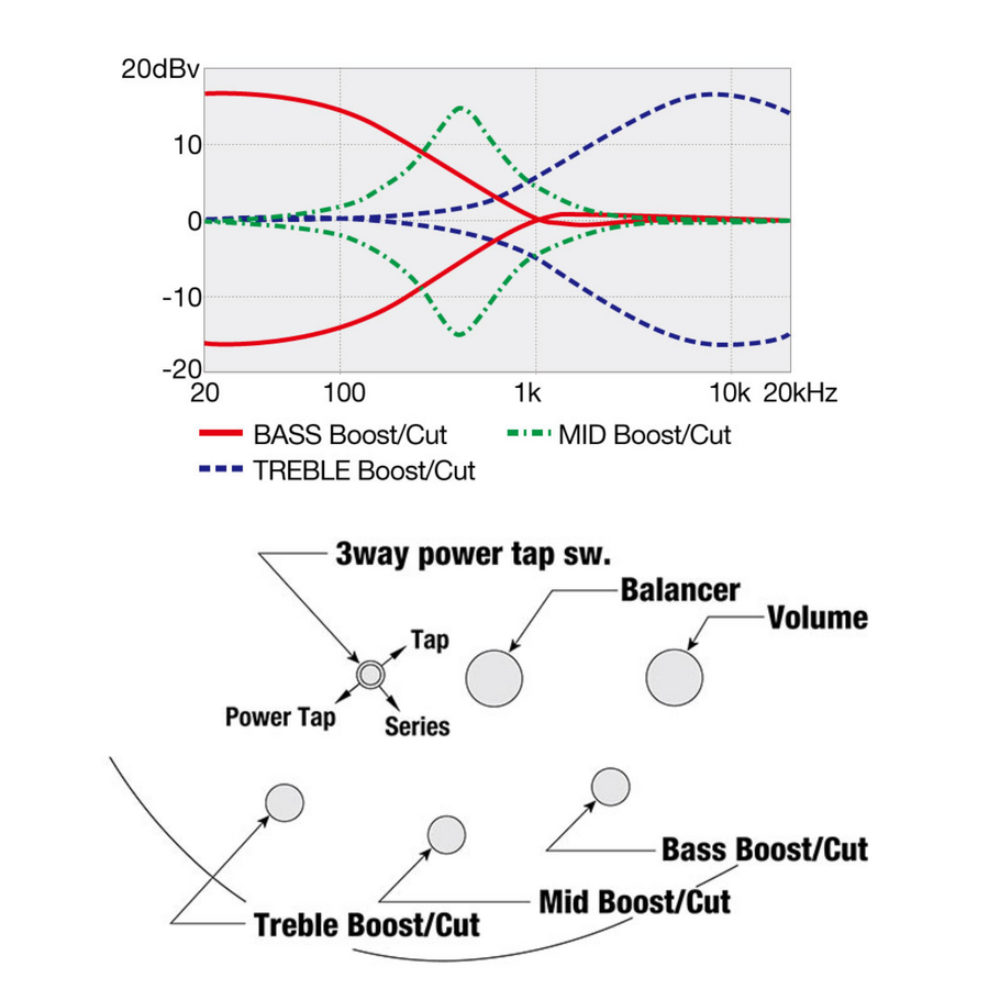 Ibanez Custom Electronics 3-band EQ The Ibanez Custom Electronics 3-band EQ is our latest refinement on the concept of simple, straightforward, no-nonsense EQ control. The Boost and Cut for the Mid Control are each centred on slightly different frequencies, an innovation that delivers a preset range of the most favourable bass tones.