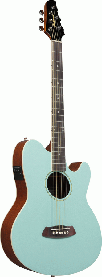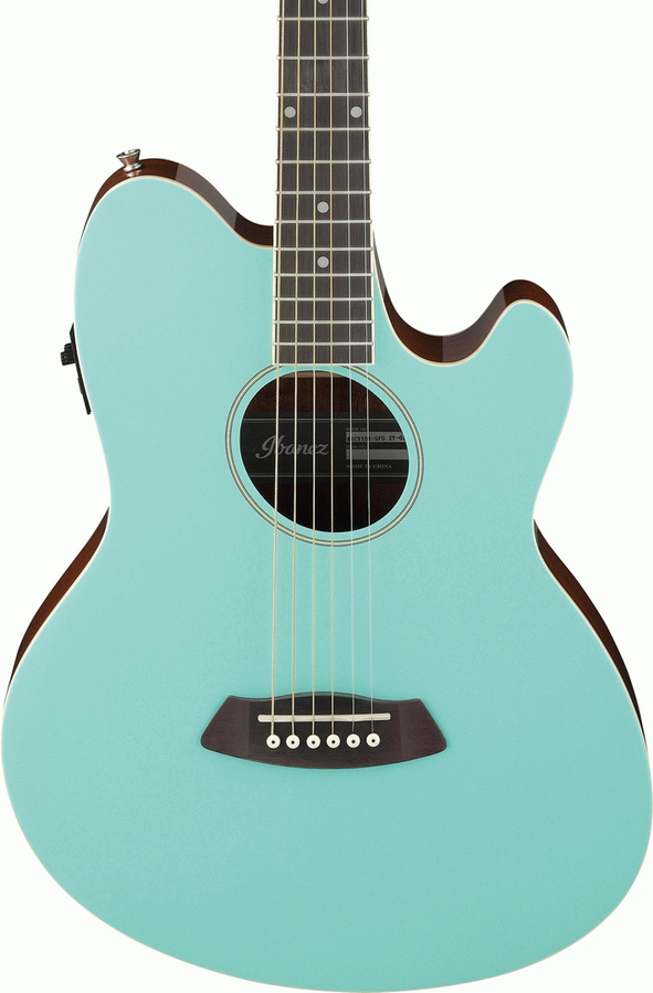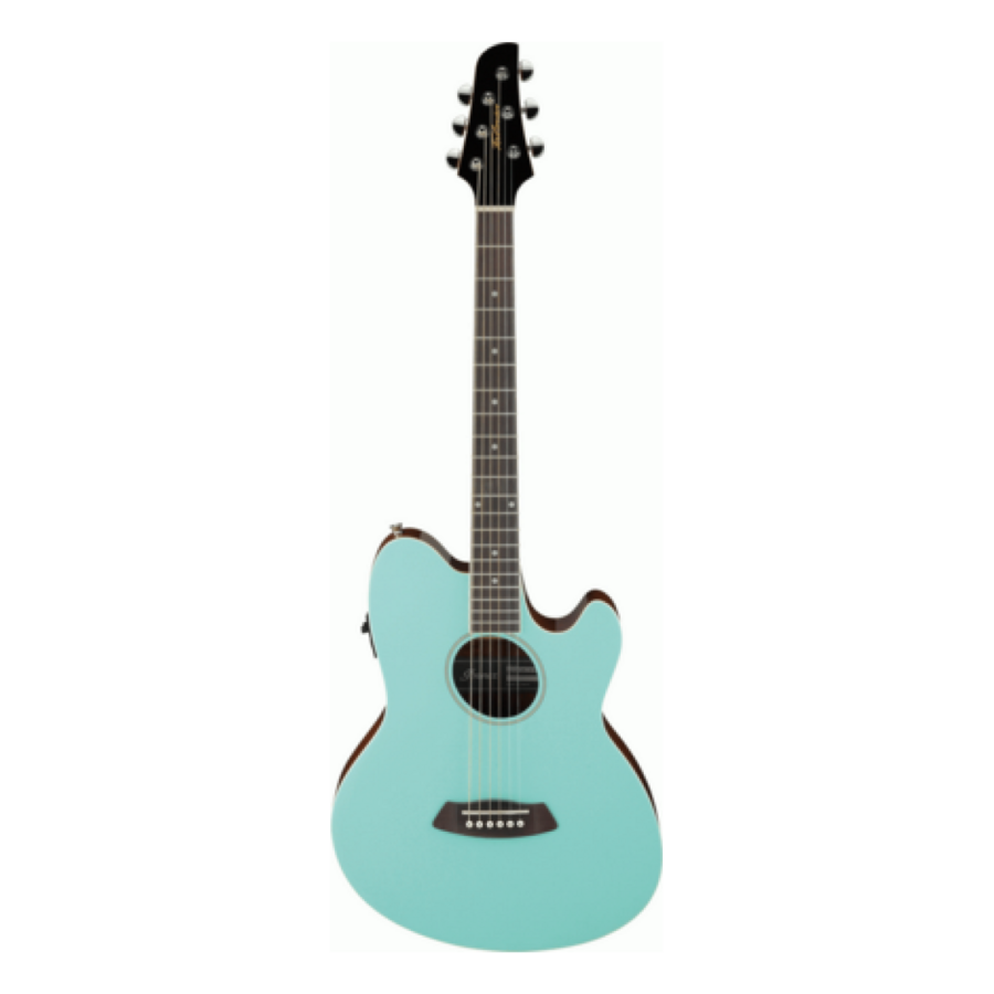 The Ibanez TCY10E SFH Electric Guitar in Sea Foam Green - You've noticed by now that we at Ibanez hold a studious respect for tradition. That said, every now and then you have to hang a right where everyone else is turning left. The double-cutaway Talman is our rebel with a cause. Electric players looking to add an acoustic-guitar dimension to their arsenal go headover- heels for this distinctive hybrid.