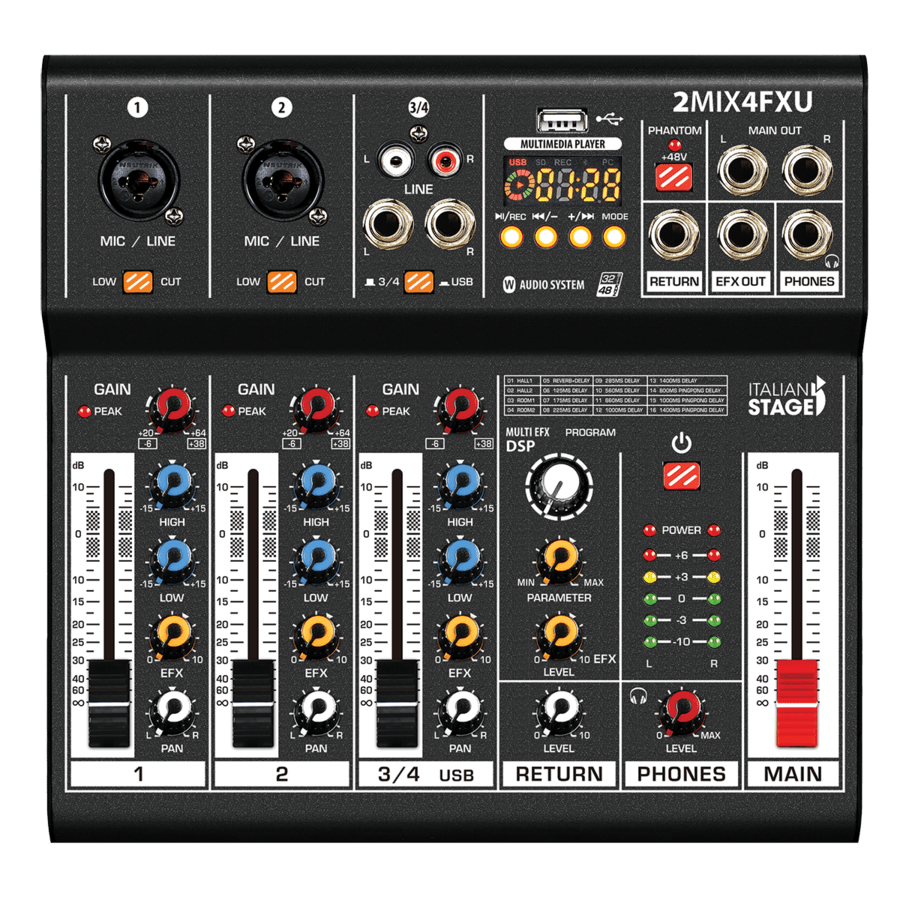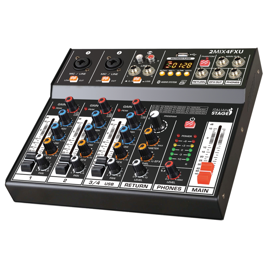 Equipped with a digital DSP Multi FX processor, the Italian Stage 2MIX lineup also works as a 2 + 2 channel USB audio interface for DAW recording / playback. The 4, 6 and 8 channel models also include USB audio with an integrated recorder / player able to record MP3 files directly on USB flash drives. You can play MP3 files as backing tracks, or play background music during live breaks.