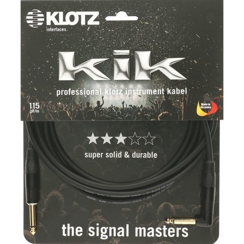 series KIK category professional instrument cable type KIK, Ø 6,1 mm, capacity 115 pF/m (35 pF/ft) shielding double screened cable, bare copper spiral shield and conductive plastic jacket PVC connector 1 Jack 2p., 6.35 mm, straight, black by KLOTZ contact 1 gold-plated connector 2 Jack 2p., 6.35 mm, angled, black by KLOTZ contact 2 gold-plated sleeve metal, black with integrated rubber sleeve length 3 m colour black shell/sleeve metal, black connectors straight - angled pins gold-plated weight 0.22 kg