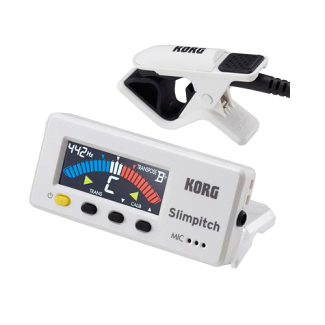 Korg Slimpitch Tuner Pearl/White | Mooloolaba Music Australia KORG Slimpitch Tuner: *Advanced color LCD for improved visibility *Compact design makes for easy portability *Dedicated mini-jack contact mic is included *Magnet allows the unit to be conveniently attached to your music stand *Protective cover can also be