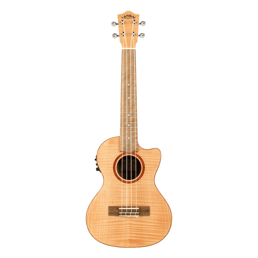 The Flame Maple with blood wood binding ukulele by Lanikai delivers dynamic new features such as a wider nut for player comfort, select figured wood, open back tuners, wood marquetry, NuBone XB nut and saddle, DAddario strings, satin finish and a padded gig bag.