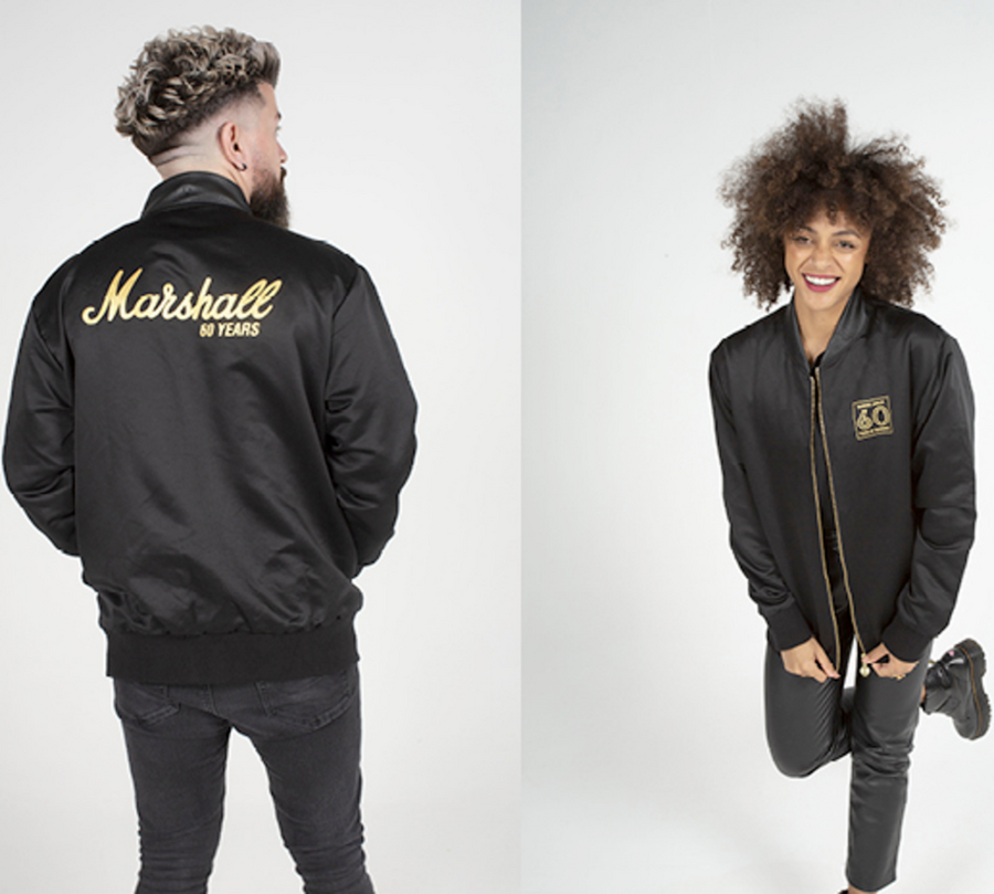 In honour of Jim Marshall who wore countless satin bomber jackets throughout his years of loud. Levant leather collar and pockets. Metallic gold ink detailing. Debossed anniversary logo on collar. Sandcasted zip pull with Marshall dial ‘ringed’ detail.