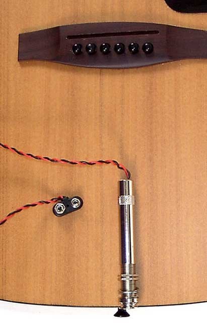 The Martin Thinline Active Jack is a miniature onboard preamp built into an oversize acoustic guitar endpin.