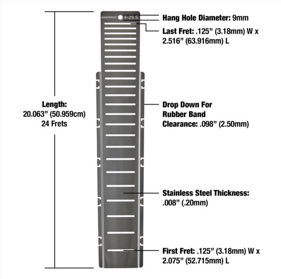 The high quality stainless steel is the perfect thickness at .008" (.20mm). We use a precision manufacturing process free of burrs and leaves all edges smooth and rounded, so it protects the fretboard without damaging it. The tapered design has slot sizes that measure from the first fret .125" (3.18mm) W x 2.075" (52.715mm) L to the last fret .125" (3.18mm) W x 2.516" (63.916mm) L and fits all fret sizes (from narrow to jumbo) found on 6 string guitars.