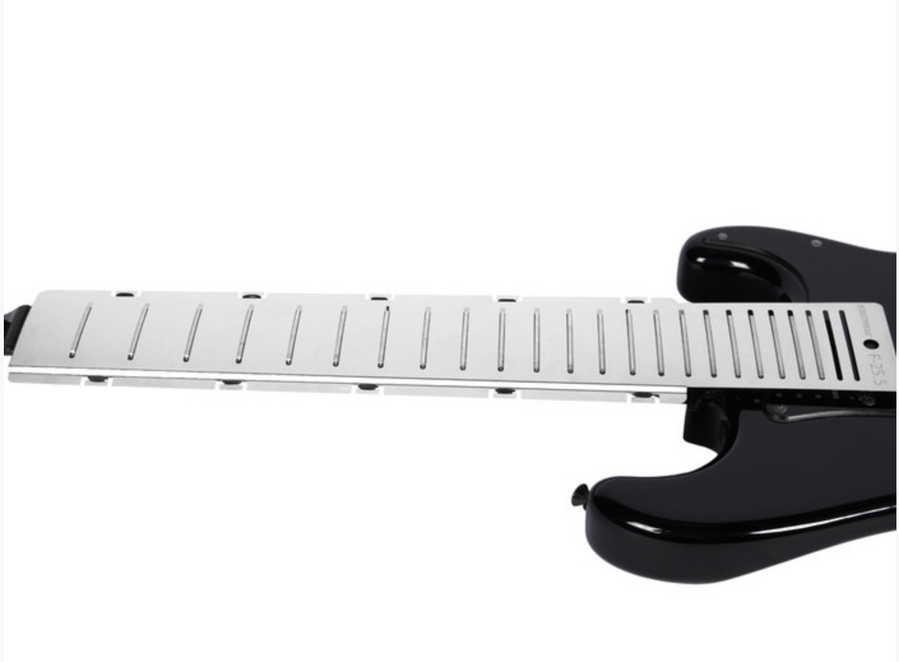 MusicNomad's patent pending Fret Shield sets a new higher standard for total fretboard protection when performing fret work such as polishing, leveling and crowning. Say "NO" to blue tape with our reusable design that goes on in seconds, fully protects without damaging the fretboard and lasts 100's of fret jobs. The high quality stainless steel is the perfect thickness at .008" (.20mm), uses a precision manufacturing process free of burrs, and leaves all edges smooth and rounded. The innovative formed drop-down edges allow the rubber bands we include to hold the Fret Shield in place securely and keep the bands below the top surface to avoid damaging them during the polishing process. Fret Shields come in the most popular Fret Scale sizes and even include a convenient hang hole. Whether your fretboard is finished maple or unfinished rosewood with inlays, your board will thank you for protecting it.