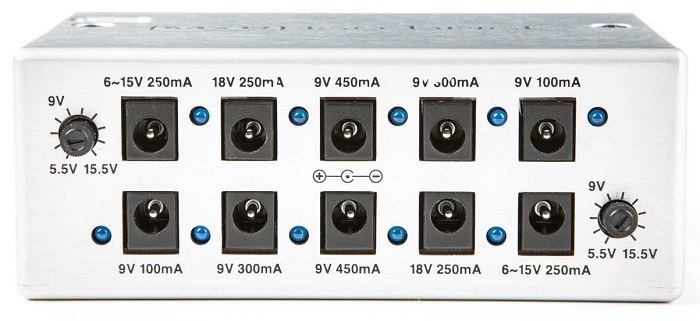 Multi power supply. 10 fully isolated outputs for a variety of voltage and current requirements: 6 x 9v, 2 x 18v and 2 x variable outputs adjustable from 6v to 15v (which can also be used to emulate a drained battery effect). Power on/off and connection status LEDs. Includes a right-angled power cable for pedal board friendly mounting flexibility. Supplied with 18v global AC adaptor.