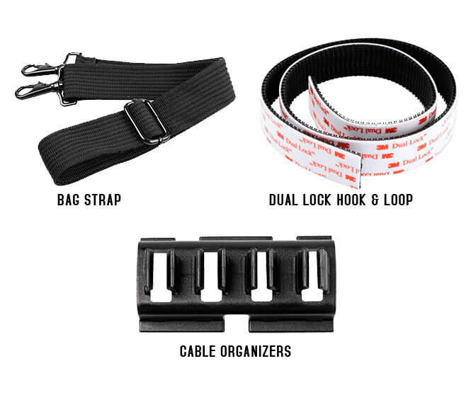Included AccessoriesComes with a light-weight carrying bag with shoulder strap made from water repellent material.Comes with 3M Dual-lock hook & loop.Comes with Cable organisers