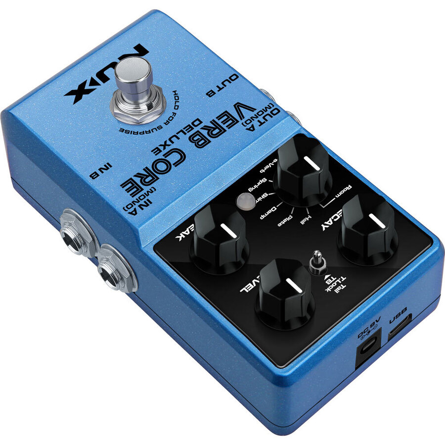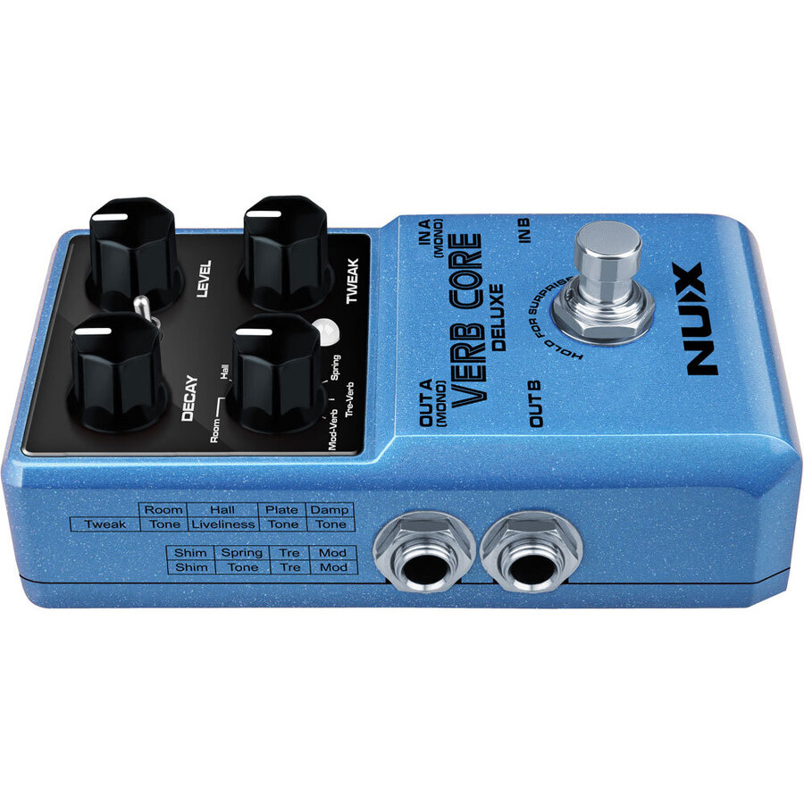 The NUX VERB CORE DELUXE is a reverb pedal with 8 different types including Room, Hall, Plate, Damp, Shim, Spring, Tre-Verb and Mod Verb. You can select the reverb type by using the Type knob.