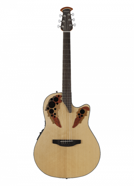 The Celebrity Collection Elite is a performance ready guitar offering striking aesthetics and pristine live sound. Ovation's unique multi-soundhole design provides clear highs and a focused, balanced bass response. The solid, Sitka spruce top has laser-cut epaulets that set it apart from the rest, and provide remarkable note for note clarity. It features a clear, natural lacquer finish. The Lyrachord® composite, mid depth body is comfortable standing or sitting and provides excellent projection. A satin-finished neck, Ovangkol fretboard and bridge all combine to make playing effortless and responsive. The Celebrity Elite is equipped with the Ovation Slimline pickup and OP-4CT preamp system with a three-band EQ, volume/gain control, onboard tuner and low-battery light that make it easy to dial in your sound. Whether you perform on stage, in church or in the garage, your Elite delivers the classic Ovation Elite sound: articulation and balance, projection, and nuanced tonal complexity.