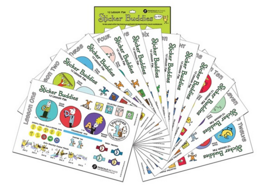 Finally, musical stickers for violin players! The Pascale Method for Beginning Violin Sticker Buddies 12-Lesson Pak, is a companion to the Pascale Method for Beginning Violin workbook. It provides students with a fun, interactive way to complete each lesson. These weekly stickers will motivate and delight students, parents, and teachers. There are scrambled daily practice puzzle, reward badges, incentives, fingerboard tapes, and much more. The humorous and quirky designs were created by Pascale Method author Susan Pascale, a violin teacher with an art degree. It's amazing what you can accomplish with the right sticker!