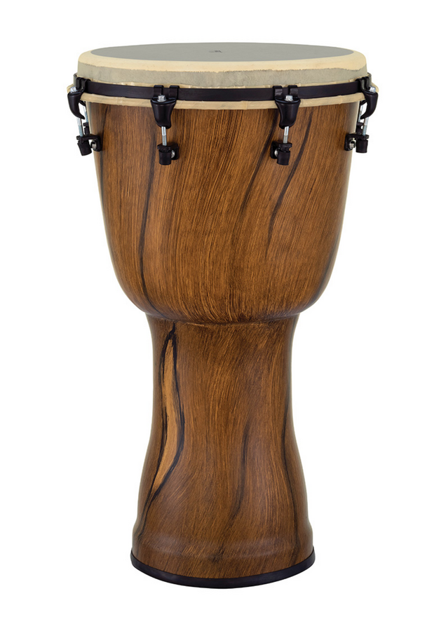 Traditional djembes are roped tuned and that tuning method requires considerable experience. Pearl's Top Tuned djembes make tuning your drum easy with a hoop and lug system that works like other acoustic drums. The tuning wrench is included with the drum. The Top Tuned djembes feature a synthetic head designed to resist detuning from moisture and temperature changes. The bottom edge of the drum is protected by a rubber rim.