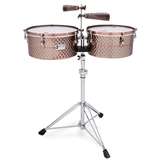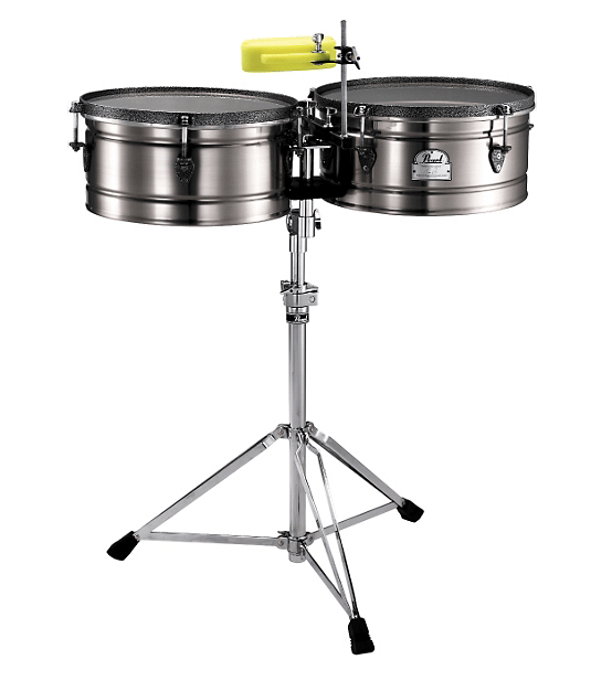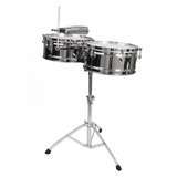 Designed in conjunction with one of today's premier percussionists, Marc's timbale set consists of standard 14" and 15" drums fitted with Remo Clear Ambassador heads, a double-braced tilting stand, and our top-selling PBL-30 Clave Block. The Polished Steel Timbale Shells have two inverse beads that not only add strength, but also produce a cutting "cascara" sound not hindered by normally outward facing beads.