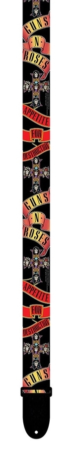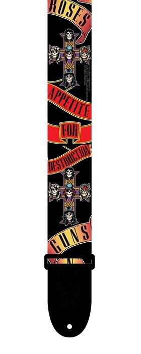 This 2" wide high resolution licensed Guns N Roses guitar strap is inspired by the "Appetite for Destruction" album. This strap is made with the adjustable length of 39" to 58" and is made with the Guns N Roses design heat transferred onto polyester webbing.