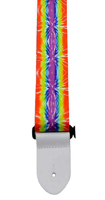 This 2" wide strap with the adjustable length of 39" to 58" is made with a heat transferred design of multi-coloured psychodelia onto polyester webbing. It also has White leather ends.