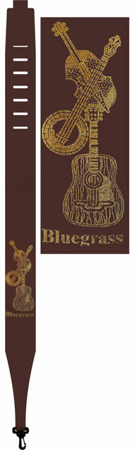 This banjo strap is made with brown leather and has a beautifully embossed gold image. It is fully adjustable and attached with non-marring plastic swivel hooks. Adjustable length from 44.5" to 53"