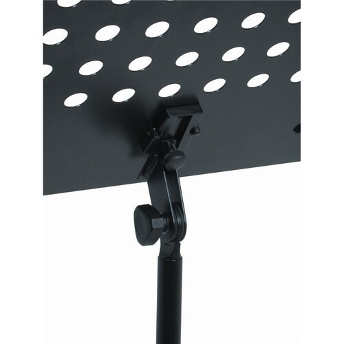 Black sheet music stand with all metal perforated music holder, manufactured using heavy duty steel tubing and high-grade hardware. Supplied with nylon carrying bag.