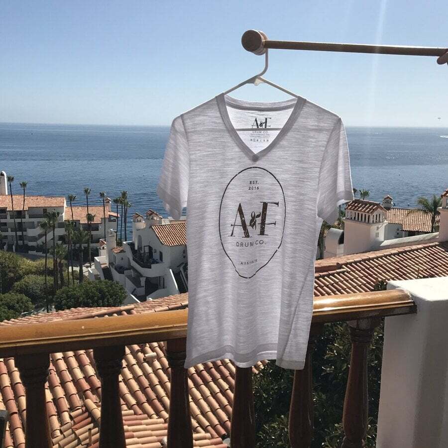 These exclusive A&F T-Shirts are a unisex pre-washed tri blend of cotton, polyester and rayon, and come in charcoal gray crew neck or white v-neck with brass colored print.