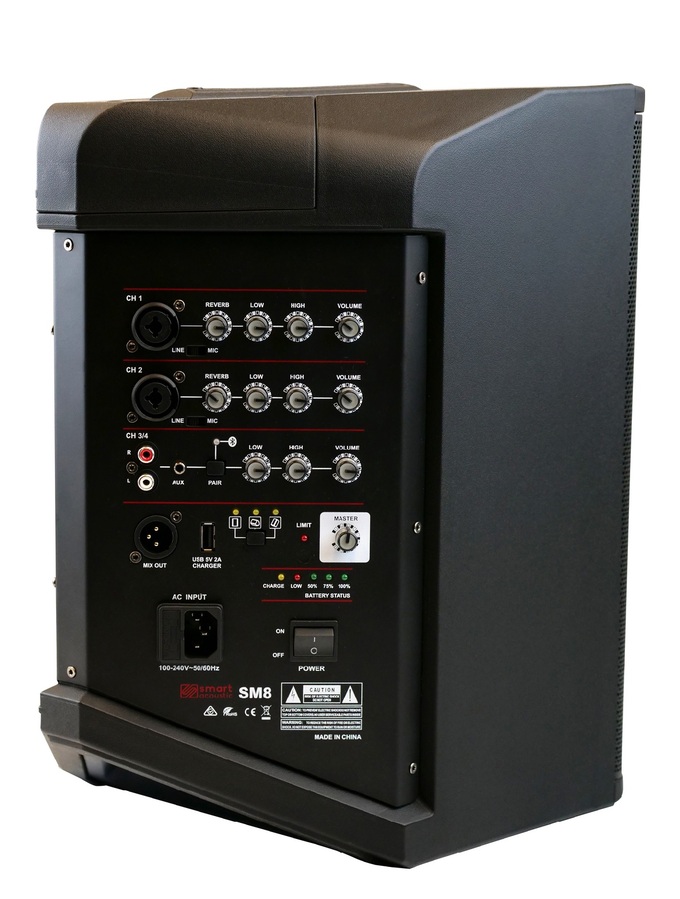 The SM8 is a Multi-Purpose 3 Channel Active Portable PA System with a Rechargeable Battery giving you the freedom to be able to use it in any application to play your sound even when power isn't available! As a step-up from the SM6, the SM8 offers 2x 120W Class D RMS amplifiers - and an 8.0" woofer, and 3 x 2.75" wideband speakers the power amplifier has the power to ensure that everyone in your group can hear what's going on. Connect via Bluetooth to any device including microphones, tablets and phones to play music or speeches - with reverb on both input channels. With a USB Charger it's the ultimate convenience, and an increased frequency response: 50Hz-20kHz and SPL: 95dB - Max SPL: 120dB.