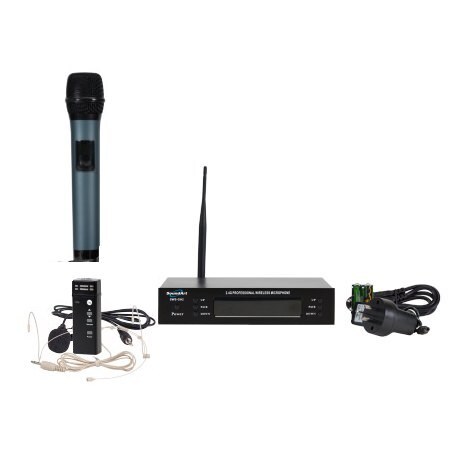 System Includes a Handheld microphone plus, you can choose to use either the Headset or the Lapel Mic for your application
