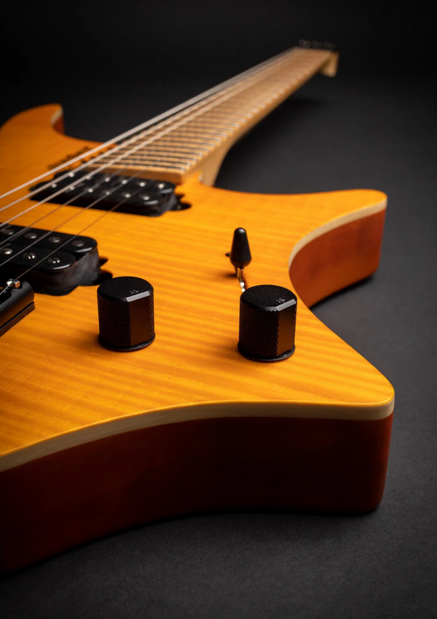 Bolt-On Construction with new sculpted neck joint heel American Basswood Body with Arm and Torso Carves Flame Maple Veneer Available Finishes: Translucent Amber, Translucent Green Approximate Weight 2,3 kg / 5 lbs +/- 10% Manufactured in Indonesia