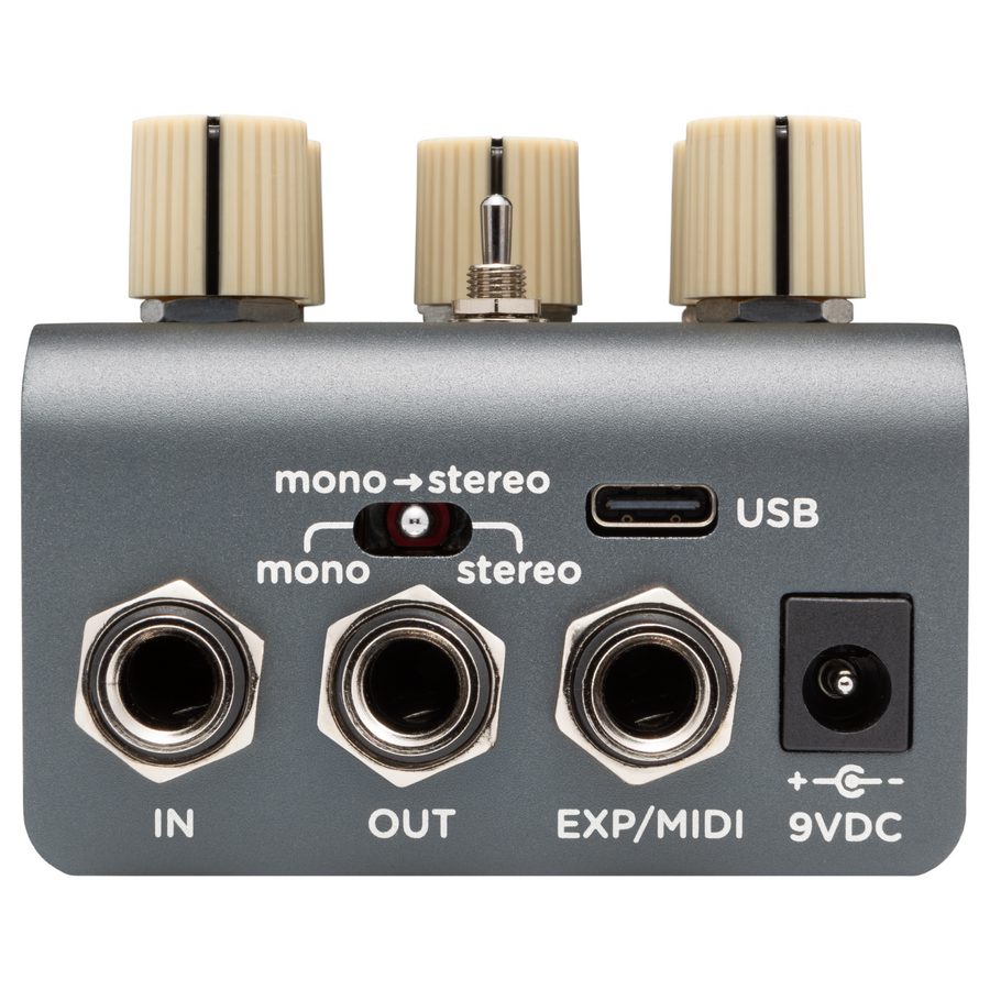 Selectable tube-modeled preamp voices. Artifact-free tap tempo. Discrete stereo operation for independent processing of the left and right stereo inputs. Straightforward controls and expression pedal capability. High-impedance, ultra-low noise discrete Class A JFET stereo input preamp for exceptional touch sensitivity, dynamics and feel. MIDI control of tempo, patch save/recall and more. Premium components, rugged construction and a USB jack for performing firmware updates or controlling the pedal from a computer.