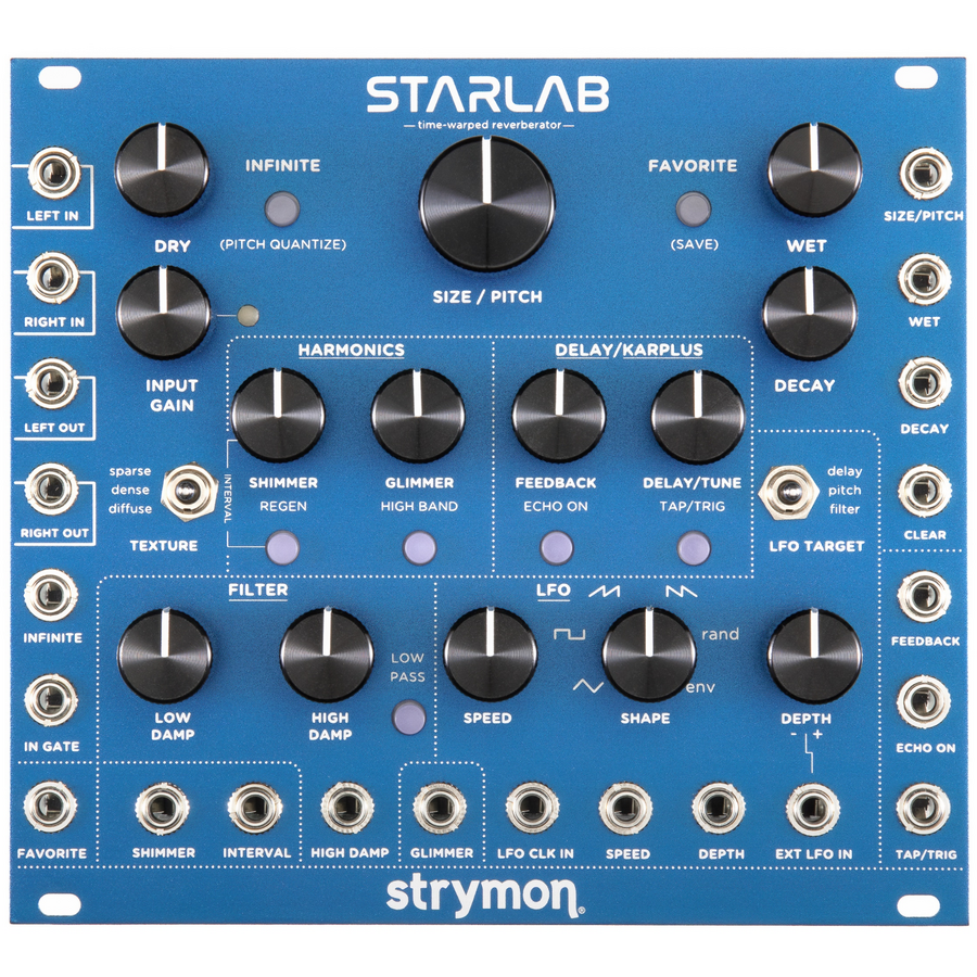 Expand the sound of your modular rack with incredibly lush, ethereal reverbs. Enhance signals with gorgeous chorus, flanging, and modulated delays. Create uniquely expressive synth voices with Karplus-Strong string synthesis. Turn simple mono audio signals into vast stereo soundscapes. StarLab is a single module that will completely transform your modular rack.