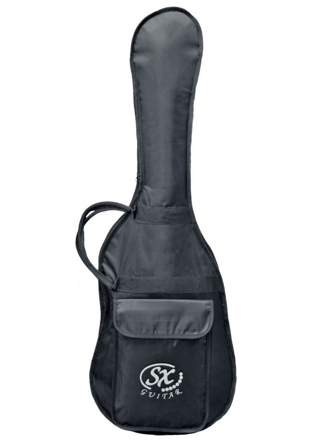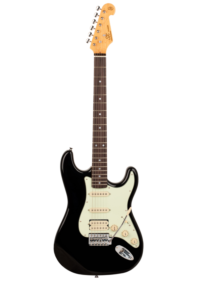 Vintage style electric guitar with humbucker, single, single pickup configuration. Traditional 60’s style solid basswood body. Maple neck with rosewood fingerboard. 21 frets. 1 humbucker (bridge) and 2 single coil pickups.1 volume and 2 tone controls. 5 way switch. Ivory pickup covers and knobs. Vintage mint green 3 ply scratchplate. Chrome Kluson style machine heads. Vintage tremolo. Supplied with SX heavy duty 7mm padded gig bag and UPlay Guitar Guide with free online lessons. Full colour display box. Black. And Laney LX15 15 watt amplifier with 2 x 5” speakers Guitar & Amp RRP $450.00. Plus: SX 7mm padded gig bag and UPlay Guitar Guide with free online lessons. 2 full colour display boxes.