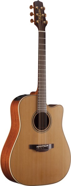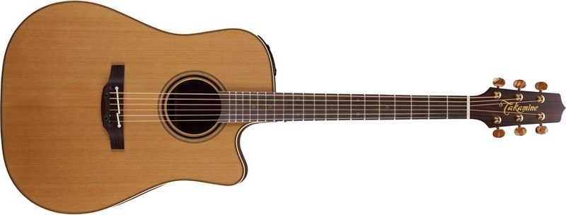 The solid cedar top features hand-scalloped X bracing and ivory binding, with dark purfling and a gorgeous concentric-ring rosette with wood marquetry. An elegant Venetian cutaway offers optimum access to the upper registers. The unique Takamine split-saddle bone bridge provides faultless intonation and excellent acoustic coupling to the top.