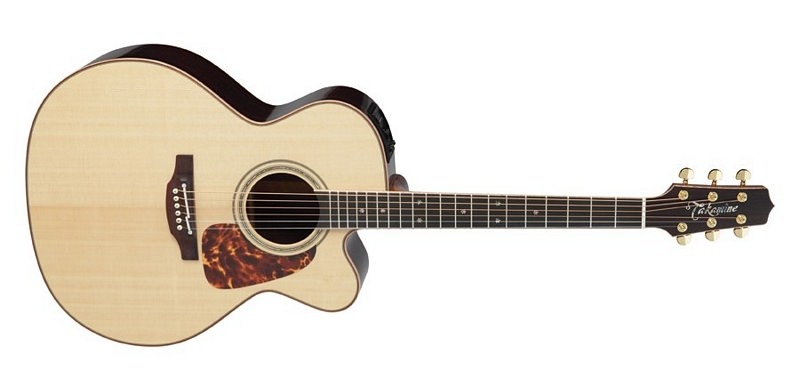 Premium design appointments include an ebony fingerboard with ivory binding, abalone "snowflake" inlays, a dark rosewood headcap with abalone Takamine logo, gold tuners with gold buttons, a natural bone nut and smooth gloss natural finish.