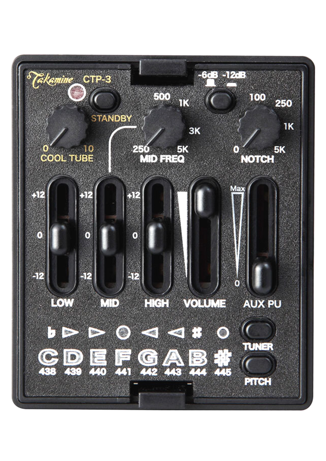 Included is Takamine's Palathetic pickup, known in the industry as one of the most accurate and natural sounding acoustic/electric pickups. The electronic performance package is beyond state of the art with the Cool Tube Preamp, the first and only tube preamp in an acoustic guitar.