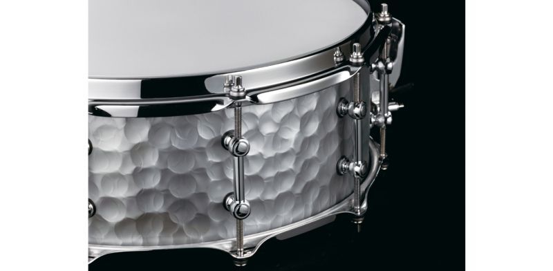 This 5.5" x 14" snare drum is crafted of 1.2mm hammered steel. The Hammered process adds tonal complexity, depth and dryness to the sounds typically associated with TAMA's steel shell, which are bright and penetrating. The more complex tones are generated from the way the sound waves asymmetrically reflect off the hammered shell texture.