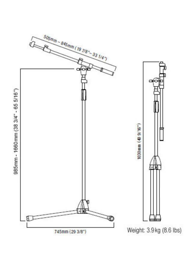 Black Finish •Cast Grip Boom Tilter •Die-Cast Locking Thumb Nut •Sure-Cast Adjustment Collar •Detachable Boom Arm Weight: 3.9kg Height: 985–1,660mm (38 3/4"–5 3/8") Arm: 505-845mm (19 7/8"-33 1/4")