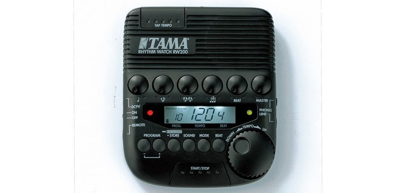 The first timekeeper designed specifically for the band's timekeeper, TAMA's Rhythm Watch has everything a drummer needs to make sure they stay on tempo-live and in the studio. Like the original Rhythm Watch, the RW200 features plenty of volume to use while playing real drums, a dial for quick tempo adjustments, separate volumes for quarter notes, eighths and triplets, but now features a large, easy to read backlit display, a more durable housing and keypad, and even more memory for pattern storage.