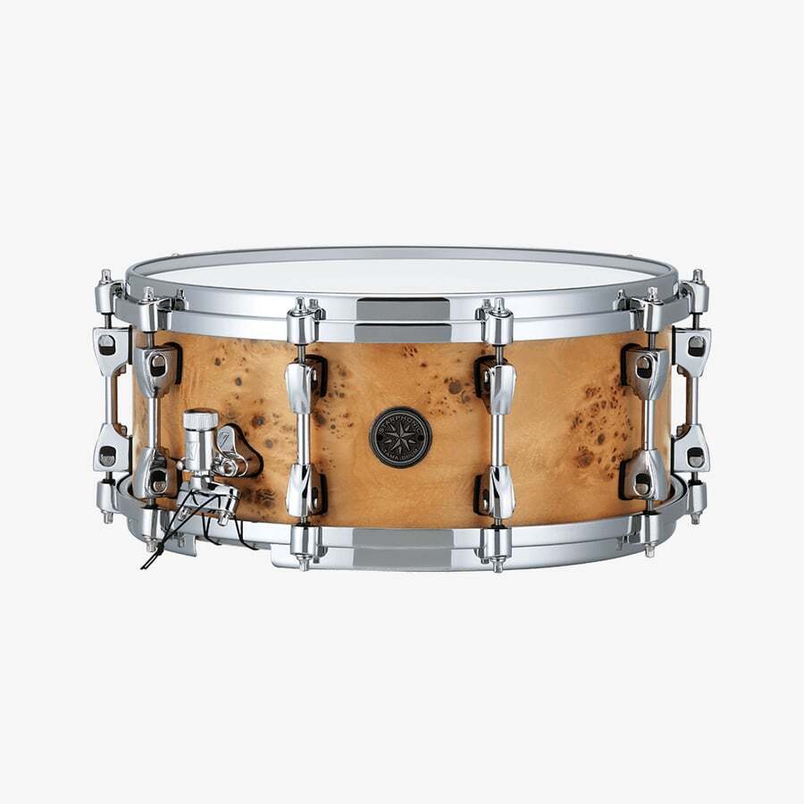 The combination of Maple's open, resonant sound with the Grooved Hoop and super sensitive Hi-Carbon Snappy gives this drum a rich, open, crisp sound reminiscent of prized vintage snares. Featuring a 6mm/6ply Japanese made maple shell, the drum is finished with a gorgeous outer ply of Mappa Burl.