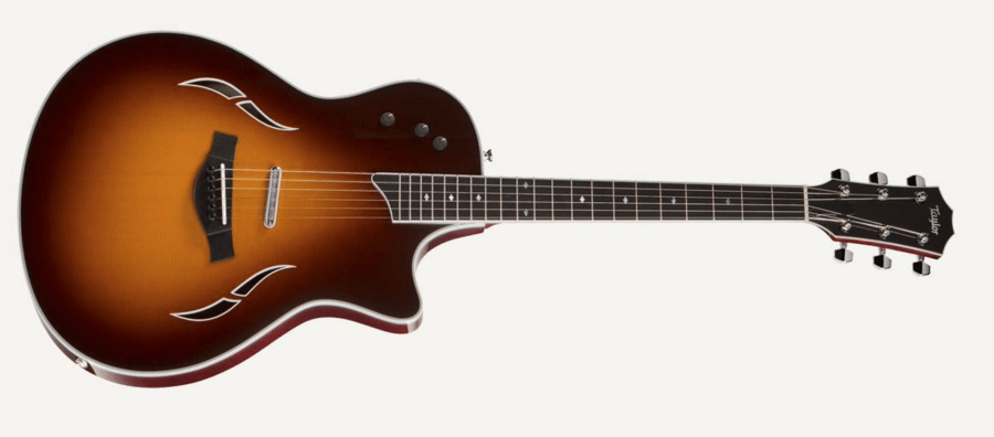 The Taylor T5 Standard features a Sitka spruce top paired with hollow sapele body, yielding a blend of acoustic resonance and electric horsepower. The electric/acoustic hybrid incorporates a three-pickup configuration: an acoustic body sensor, a concealed neck humbucker, and a visible bridge humbucker. Run the T5 through an acoustic and electric amp and work the five-way switch to fully experience the guitar’s tonal range. Color options include Black, Honey Sunburst and Tobacco Sunburst. Featured appointments include chrome hardware, nickel hardware, crisp white binding and a Small Diamond inlay scheme. The guitar ships in a Taylor T5 hardshell case.