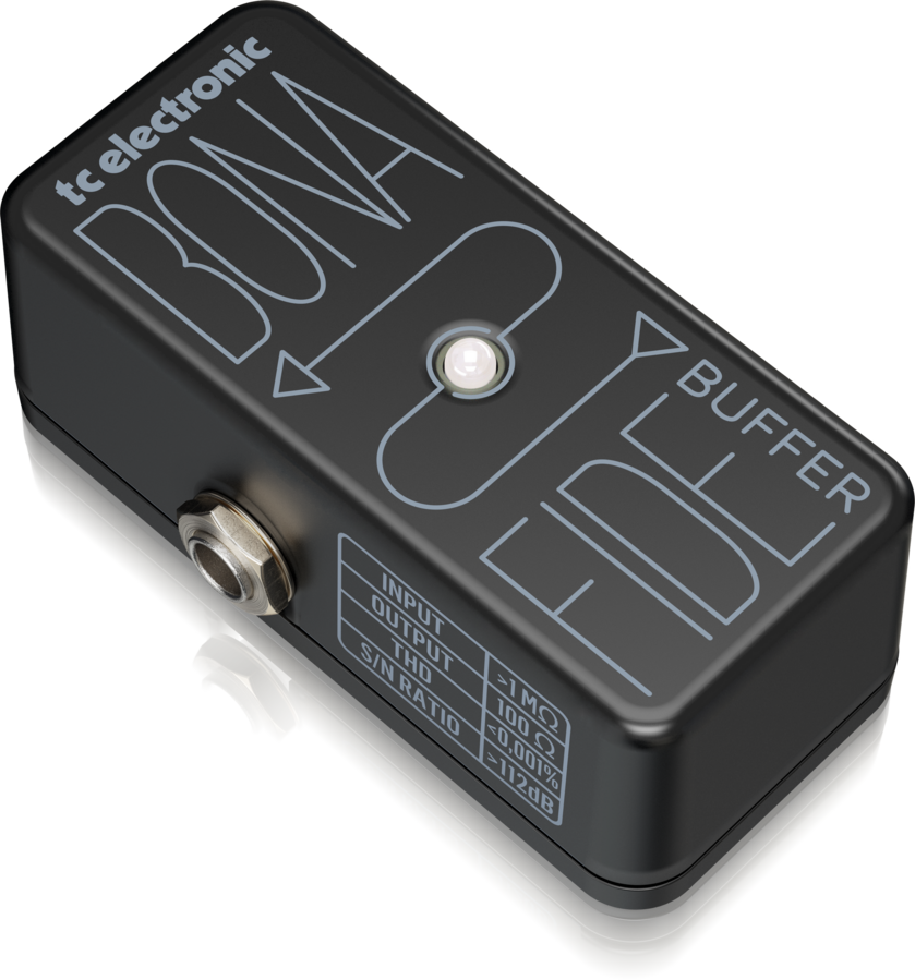 Ultra-Compact High-Quality Analog Buffer with Automatic True Bypass,Ultra-compact analog buffer features a high-quality tone tool to protect your valuable guitar tone,Play through long cable runs and convoluted pedal boards without any tone loss or signal distortion,Superior analog buffering turns 1 M½ guitar output into a tone-saving 100 ½ low impedance and low noise signal,Intelligent bypass relay automatically switches to true bypass if power is cut so your signal still comes through