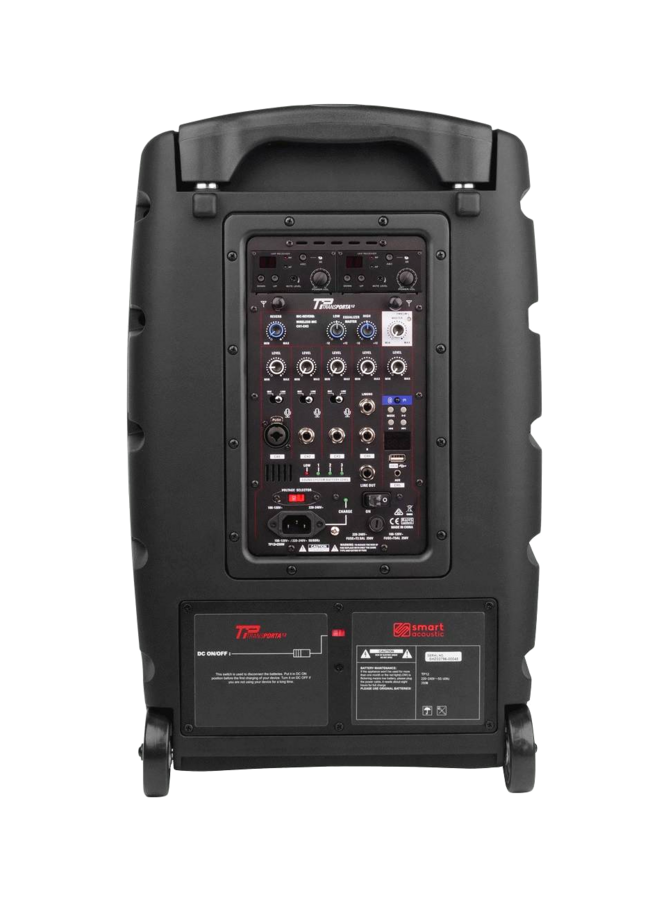 Item No: TP10 Type: Two-way full range active mobile PA system Power: Mains supply: 150W RMS, Battery: 80W RMS Impedance: 4 Ohms Frequency Range (-10dB): 60Hz - 20kHz MAX SPL @ 1m: 118dB Inputs: 6.35mm TRS/XLR Combo (Balanced) x 1 6.35mm TS (Unbalanced) x 2 6.35mm TS L/R (Unbalanced) x 1 USB(MP3)/Bluetooth Stereo 3.5mm TRS jack x 1 UHF wireless microphone receiver x 2