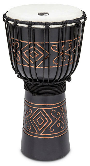 Each shell is carved from a single piece of environmentally friendly plantation-grown mahogany wood. 20 coats of teak oil are then applied to the shell to protect and preserve the wood. Each drum comes fitted with an all-weather, synthetic head which eliminates stretching, drying or losing pitch. Onyx carved finish.