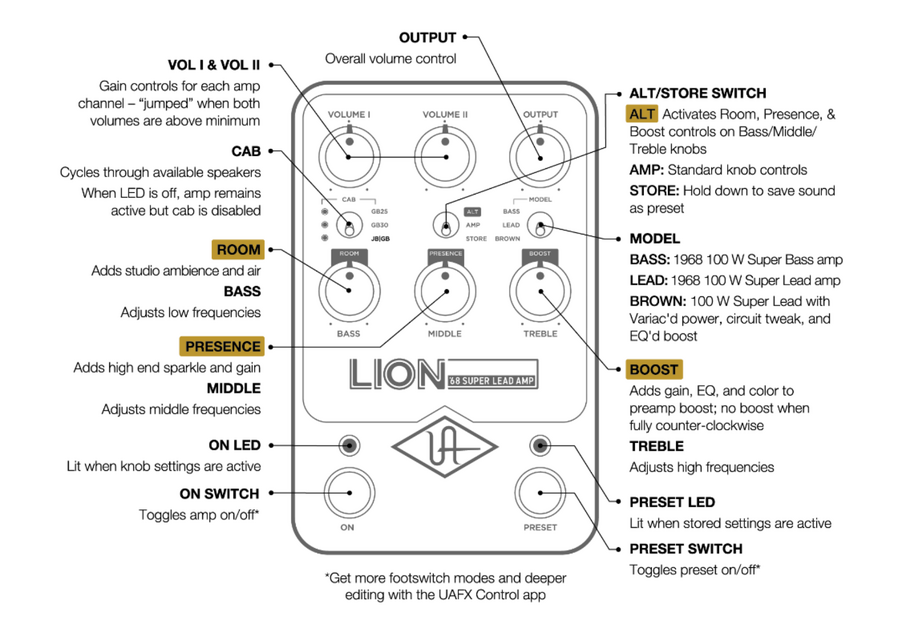 ** Product names used herein are trademarks of their respective owners, which are in no way affiliated with Universal Audio Inc. These name(s) are used solely to identify products studied in the creation of the sound models found in Lion '68 Super Lead Amp.