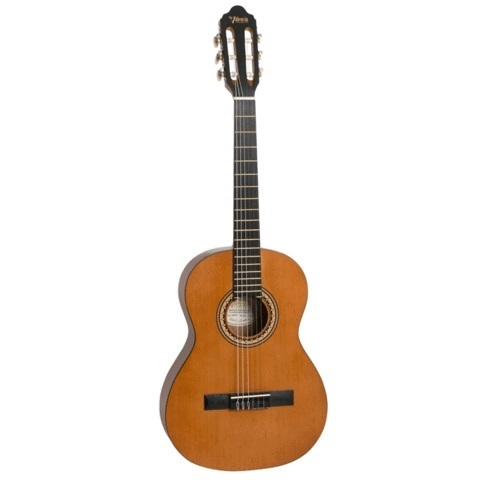 Model: VC204H Body Shape: Classical Guitar Size: 4/4 Colour: Antique Natural Full Color Packaging: Yes Top: Sitka Spruce Back & Sides: Nato Top Binding: ABS – Black Neck: Jabon with Rosewood Reinforcing Strips Fingerboard: Ebonized Mahogany Neck Binding: ABS – Black Neck Side Dots: Yes Fret Wire: 19 Frets; Brass Bridge: Ebonized Mahogany Bridge Saddle: Plastic; China Rosette Decoration: Valencia “Bat” motif Machine Heads: Nickel Plated with Cream Buttons Strings: China Scale: 650 mm (25 5/8”) Nut Width: 45 mm (1 3/4”) Finish: Satin