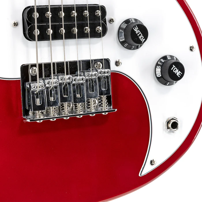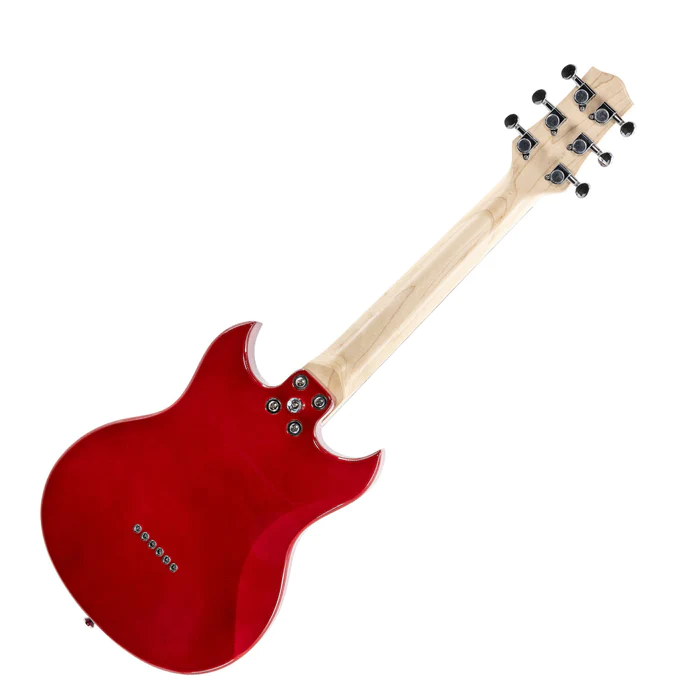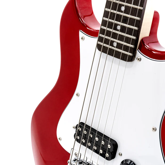 Play your favourite riffs at the park, the subway, or the tour bus! The new VOX SDC-1 mini provides the sound and feel of a full sized electric guitar in a compact format. Play with the same tuning as a standard guitar but on a 479mm short scale format. It also features high gear ratio tuning heads especially designed for short scale guitars to allow easy and accurate tuning. Red finish, carry bag included.