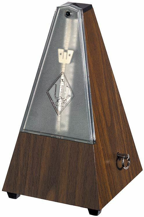 Plastic casing, Walnut grain, with bell metronome with a mechanical clockwork, No batteries required, Made in Germany.