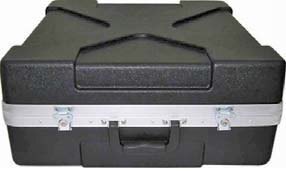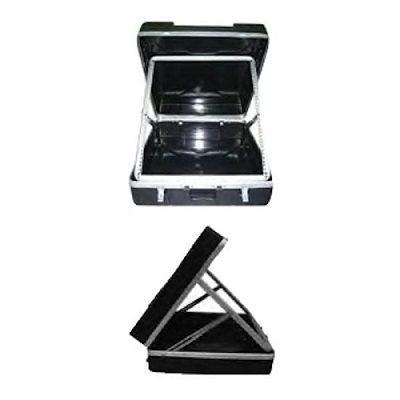 Mixer case. Black ABS moulded. Fold-up rack frame with multi position rachet tilt adjustment. Aluminium valance. Butterfly latches. Detachable lid. Internal dimensions: 45cm (W) x 53.5cm (D) x 20cm (H). Base depth 11cm. For mixers up to 12 rack space.